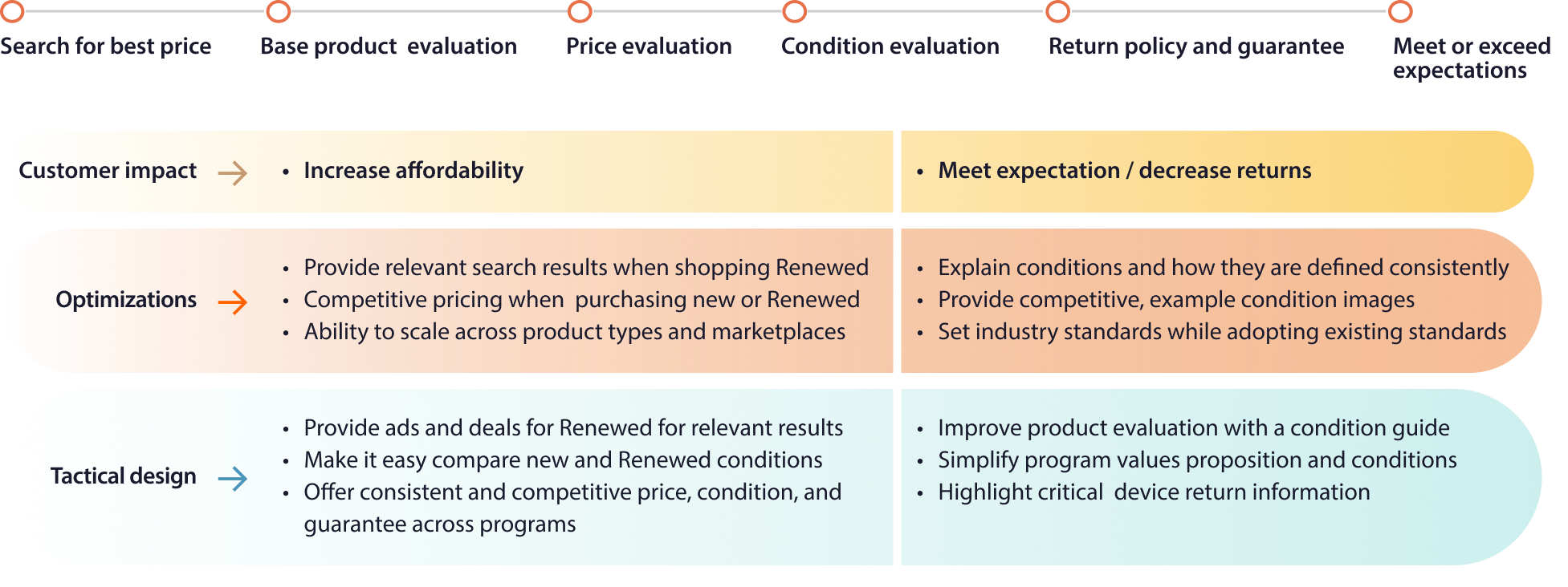 Improved visibility and clarity around Amazon's preowned selection, as only 25-30% of customers could easily locate these items on the site. "Refurbished" emerged as the most effective term, as it signals quality control and inspires trust, while also conveying sustainability through repair and reuse. Professional inspection, testing, and the Renewed Guarantee give customers confidence that they are purchasing a reliable, fully functional product.